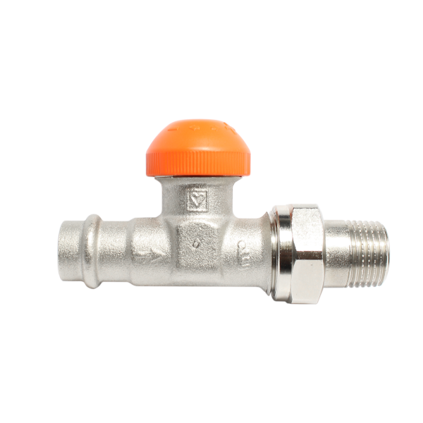 HERZ-TS-98-V thermostatic valve, straight model. Radiator connection with cone. The valve body with Pressfit connection is suitable for connection to stainless steel and copper pipes. Press contour V, minimum pressing force 30 kN.