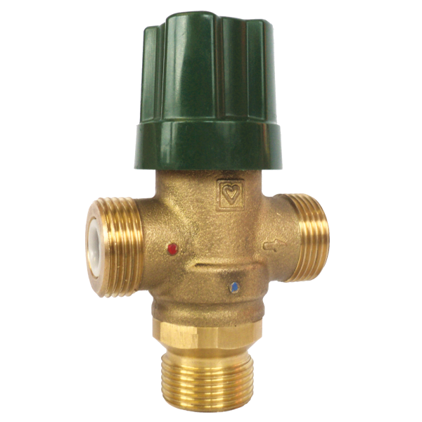 with outlet to the side, 3 × MT 3/4". Enables Legionella flushing. Factory setting of the mixing temperature permanently set to 50 °C; mixing precision ± 2 °C; maximum inlet temperature 85 °C; maximum operating pressure 10 bar.
