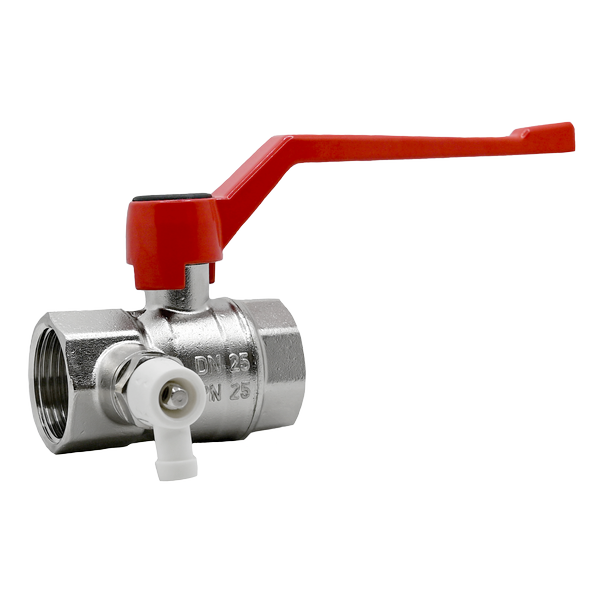 mit M10-Gewinde für Wasserzählersensor. Ausführung Muffe × Muffe. Stopfen M10 mit Teflondichtung, Entleerventil G 1/4", Gehäuse aus geschmiedetem Messing, vernickelt, Kugel aus geschmiedetem Messing, verchromt. Kugeldichtungen PTFE, Spindeldichtung mit PTFE. Gewinde nach ISO 228. Betriebstemperaturbereich: -10 °C bis +110 °C (Wasser +0,5 °C bis +110 °C – kein Dampf).