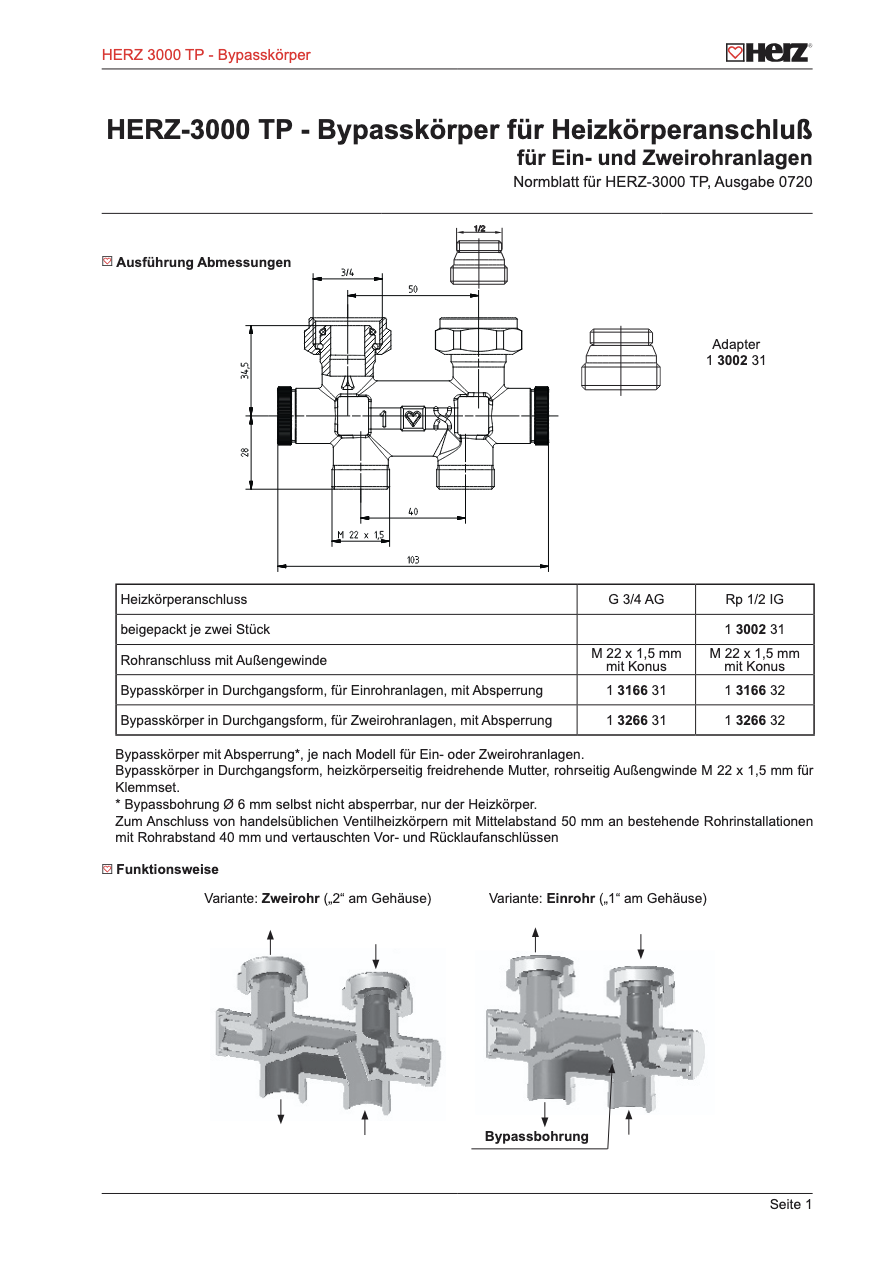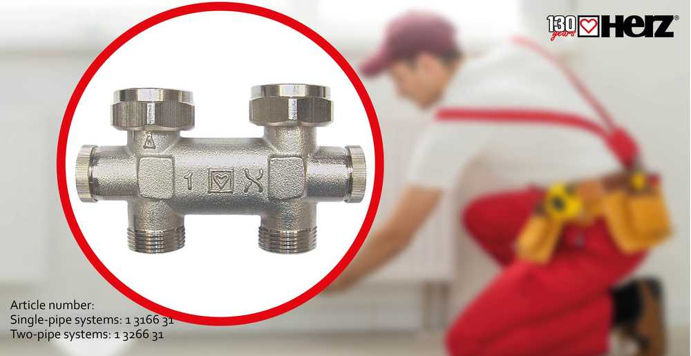 HERZ 3000-TP bypass body for single and two-pipe heating systems reliably compensates for the difference between 40 mm pipe spacing on the floor and 50 mm connection spacing on the radiator. This allows the radiator to be connected correctly and without tension to the existing piping.